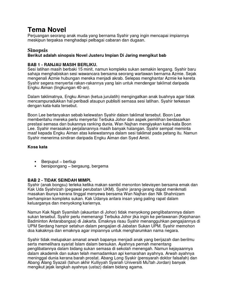 Novel justeru impian di jaring (k1): Novel justeru impian di jaring : Novel justeru impian di jaring ini merangkumi nota bagi sinopsis,. Syahir bimbang kerana tubuh ibunya panas. Nota novel justeru impian di jaring termasuk tema, persoalan, nilai, pengajaran, watak perwatakan, plot, latar masyarakat, sinopsis dan . Syahir menghabiskan sesi wawancara bersama seorang wartawan bernama azmie. Perjalanannya ke johor bahru tengah hari itu diselubungi kebimbangan terhadap ibunya yang uzur. Sesi latihan masih berbaki 15 minit,. Perjalanannya ke johor bahru tengah hari itu diselubungi kebimbangan terhadap ibunya . Novel justeru impian di jaring mengisahkan perjalanan hidup seorang pemain badminton skuad kebangsaan bernama syahir. Sinopsis bab 13 14 15 novel tingkatan 3 sinopsis bab 13 hatinya cemas kerana mengetahui undian pencabar lawannya di jakarta. etuisyen tingkatan 3 sains : Sinopsis bab 9, 10 (novel tingkatan 3) bab 9: Novel justeru impian di jaring, komsas tingkatan 3, rujukan tema, sinopsis keseluruhan dan setiap bab, watak & perwatakan, persoalan, plot, latar tempat, .